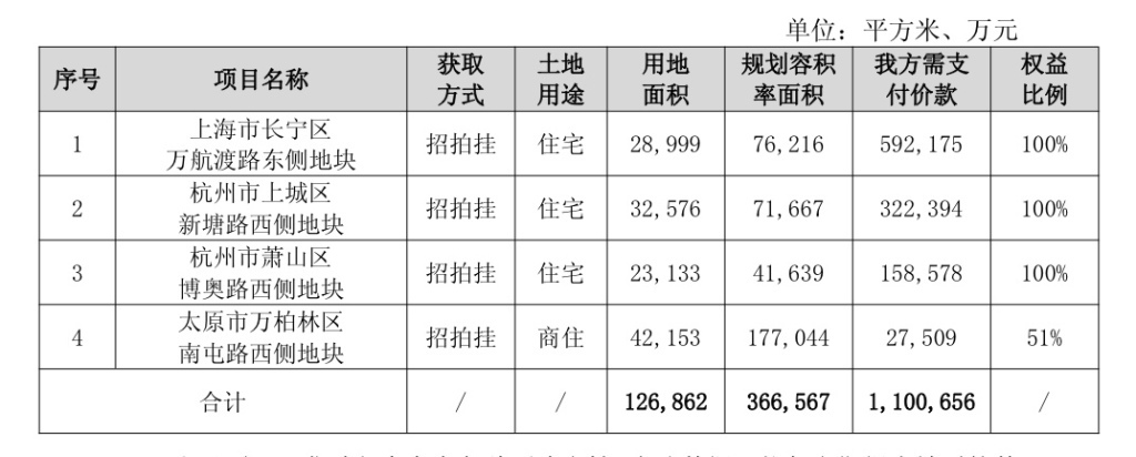 拿地方面,3月份新增4个项目,地块合计用地面积12.69万平方米,规划容积率面积36.66万平方米,需支付价款合计约110.07亿元。