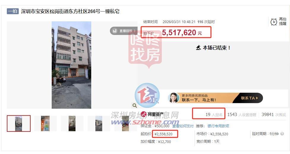 3月19日,宝安松岗红星社区一栋私宅,吸引了21人报名、263次叫价,成交价从385万飙升至800万,溢价率超100%。