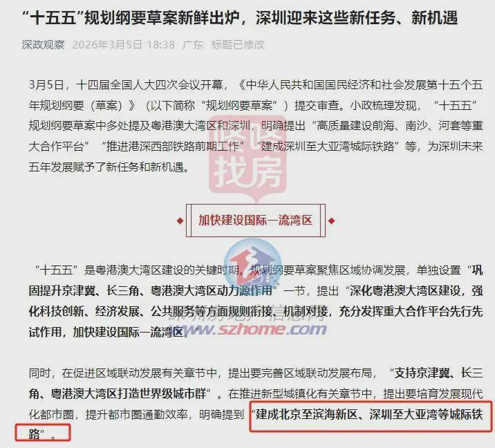 “十五五”规划纲要草案中多处提及粤港澳大湾区和深圳,明确提出“高质量建设前海、南沙、河套等重大合作平台”“推进港深西部铁路前期工作”,并明确提到“建成深圳至大亚湾等城际铁路”。