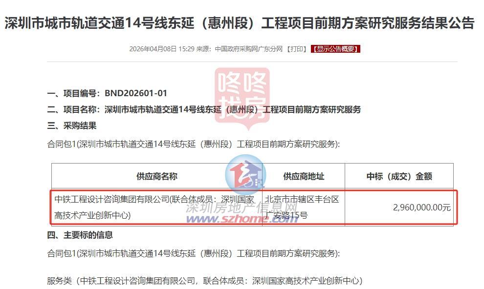 近日,深圳市城市轨道交通14号线东延(惠州段)工程项目前期方案研究服务结果公告对外发布。