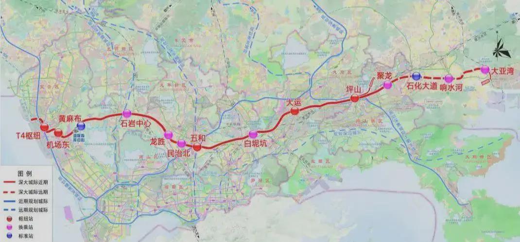 深大城际,是连接深圳北部东西组团并直通机场的快速通道,起于深圳机场,终至惠州大亚湾。