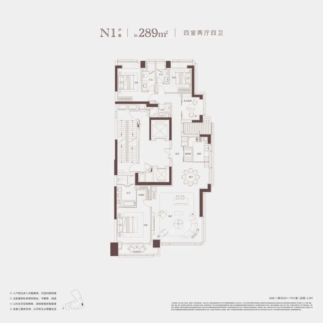 而在户型空间的打磨上,新弘·北京道延续了弘久那种“偏执”的产品主义,特邀CCD、戴昆、HWCD三大全球室内团队联袂设计,所有户型主打“平权主义”:全系全套房配置,老人房、主人房、儿童房,每间都带独立卫浴。传统户型里那种隐秘的等级秩序被悄悄拆掉了。多代同堂的家庭,老人早起不会吵到年轻人,孩子有自己的小天地。