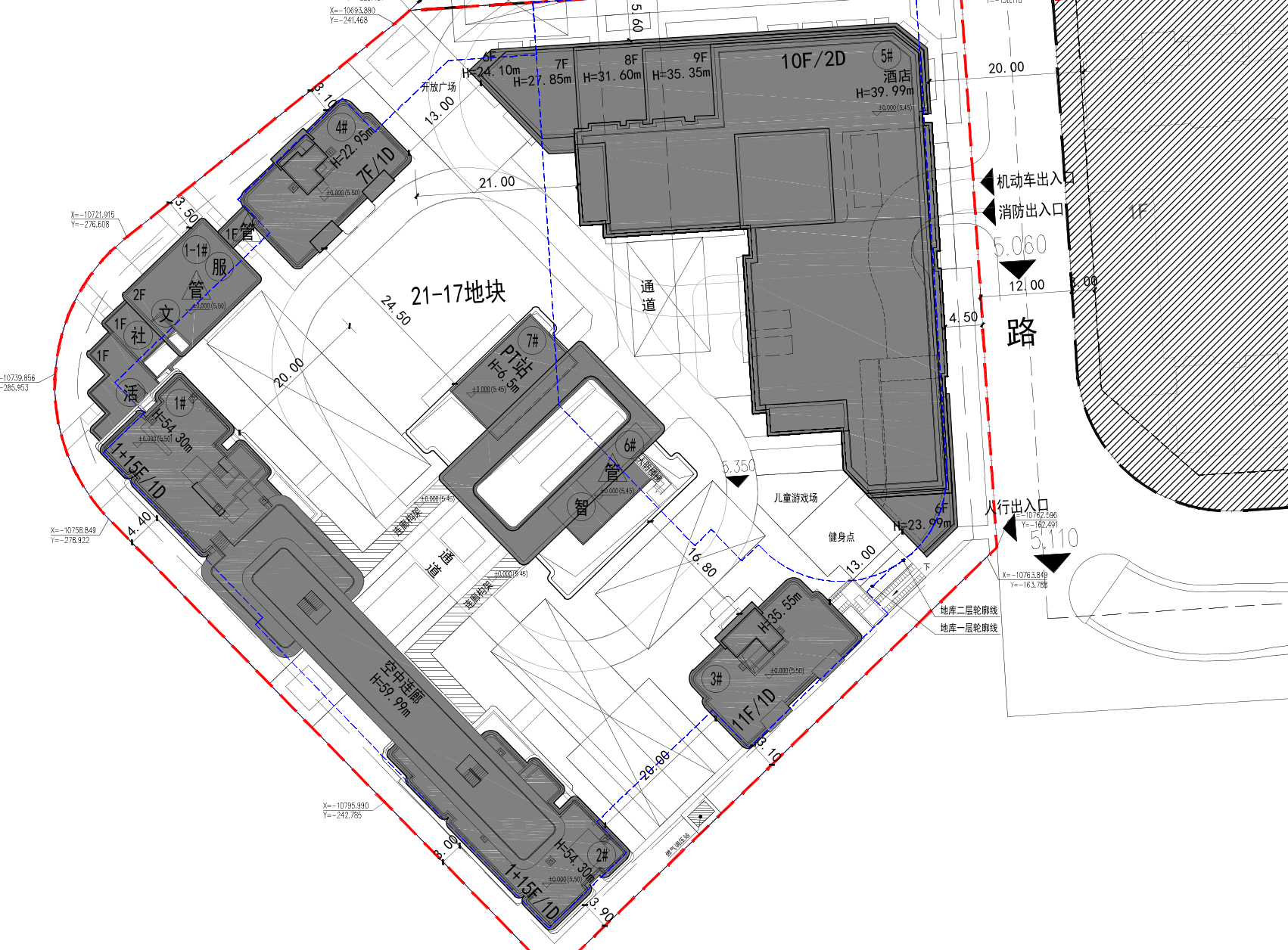 根据规划,21-17地块为三类住宅组团用地和商业服务业用地,东至皓明路,南至21-08绿化,西至21-08绿化,北至21-16地块。用地面积10914.37平方米,总建筑面积48572.99平方米,其中计容面积32743.11平方米,地上建筑面积35648.18平方米,地下建筑面积12924.81平方米。