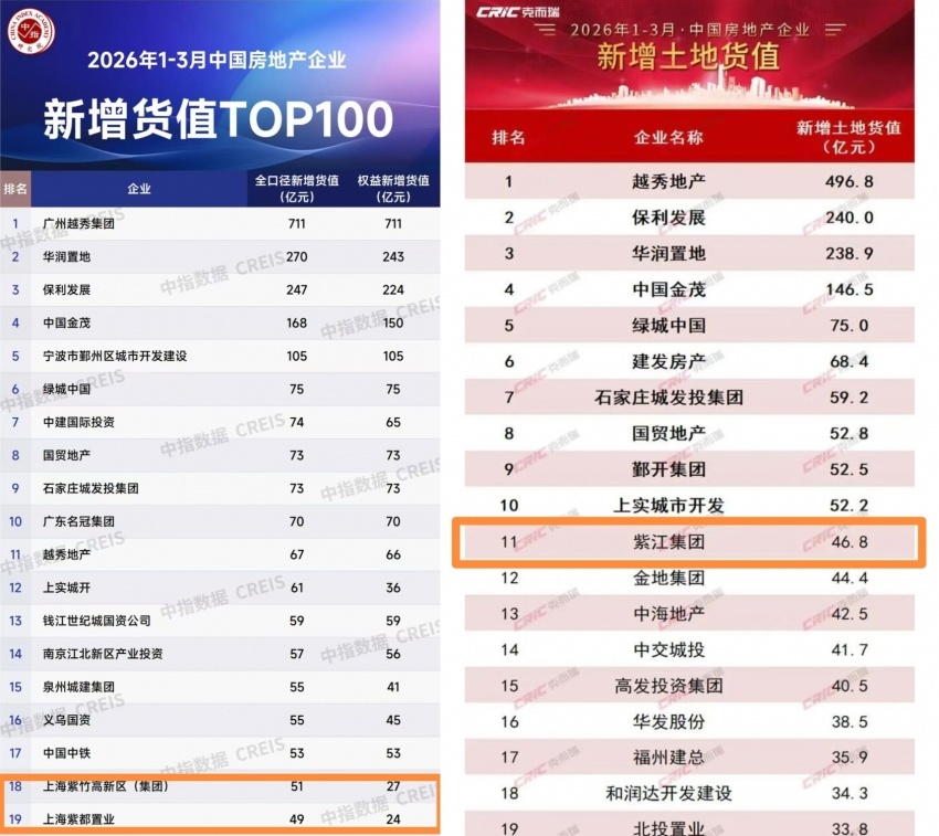 2026年开局,上海土拍市场跑出一匹“黑马”——自1月6日上海紫竹半岛地产有限公司(母公司为“上海紫竹高新区(集团)有限公司”)联合上海紫都置业发展有限公司以20亿元总价竞得闵行区兰香湖地块,两家直接冲到了中指研究院《2026年1-3月中国房地产企业新增货值TOP100》的第18名和第19名。