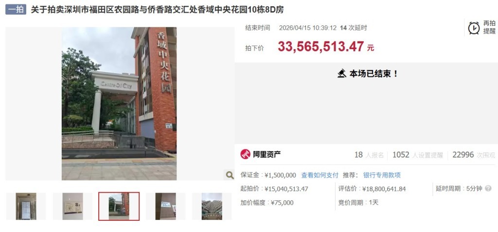 4月15日,阿里资产司法平台显示,深圳市福田区香蜜湖香域中央花园一套法拍房源以3356.6万元成交,较起拍价溢价123%。