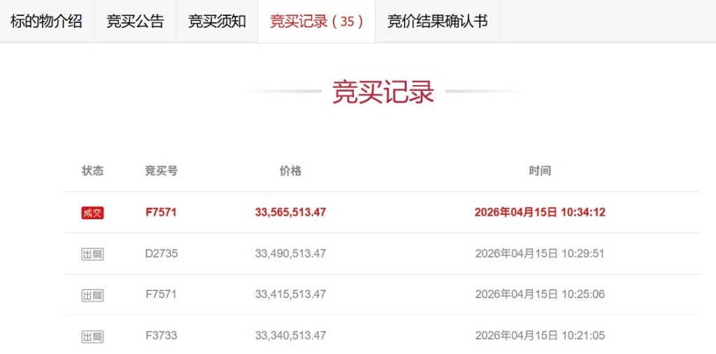 竞买记录显示,该房源经过35轮竞价、14次延时后,由用户黄某以最高应价胜出,成交单价约16.48万元/平方米,溢价率达123%。