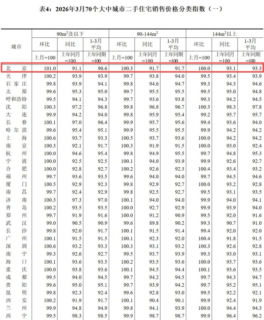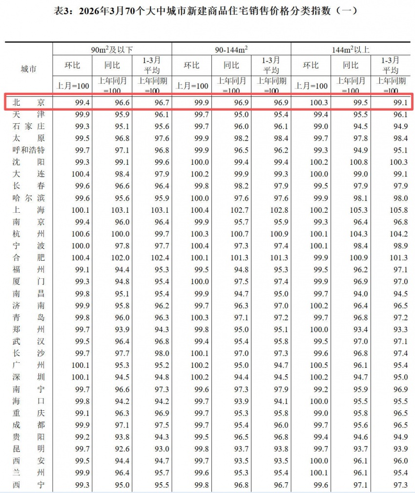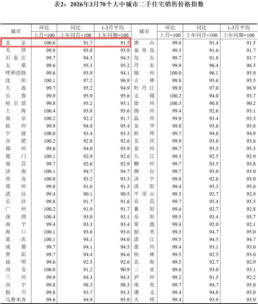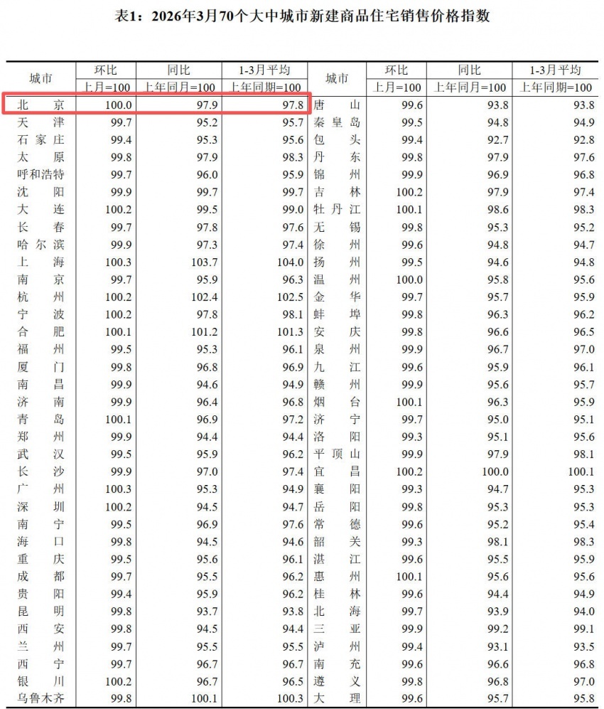 凤凰网房产北京讯 4月16日消息,国家统计局公布《2026年3月份70个大中城市商品住宅销售价格变动情况》。具体来看,3月北京新建商品住宅价格环比持平,同比下降2.1%,同比跌幅有所收紧;二手房住宅价格环比上涨0.6%,同比下降8.3%,环比涨幅持续扩大,且涨幅领跑全国。