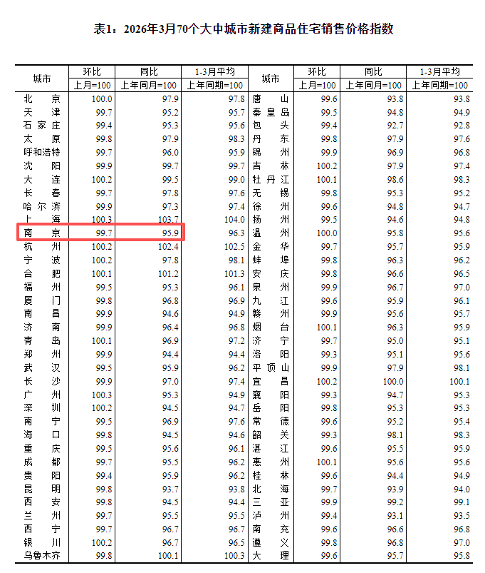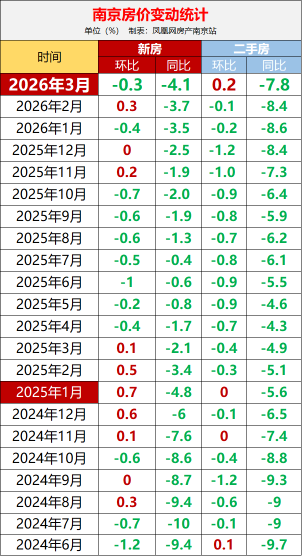 刚刚,据国家统计局官方最新发布,2026年3月南京新房价格环比下跌0.3%,同比下跌4.1%,二手房环比上涨0.2%,同比下跌7.8%,同比降幅收窄。