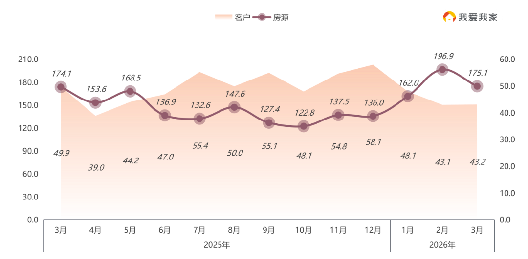 从成交周期来看,3月南京二手客户成交周期相对稳定,平均成交天数43.2天,环比缩短0.1天;房源平均成交天数175.1天,环比缩短21.8天,整体来看,随着市场行情回暖,房客成交节奏明显加快。