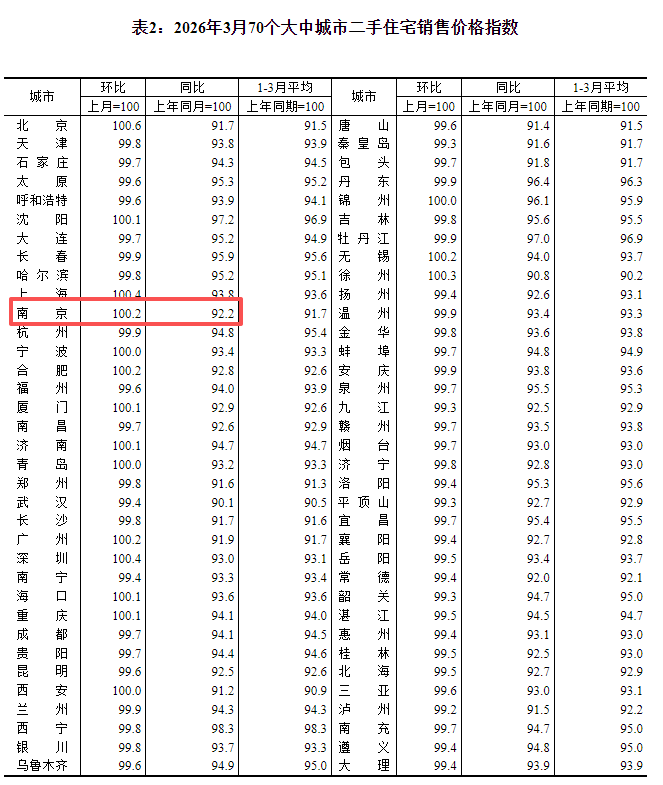 2026年3月,南京二手房价格环比上涨0.2%,同比下跌7.8%。时隔两年,南京二手房价终于迎来拐点,将进一步提升市场信心。
