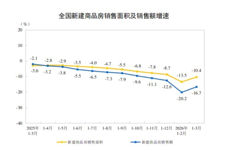 4月16日,国家统计局发布2026年1—3月份全国房地产市场基本情况。数据显示,一季度全国商品房销售降幅较前两月明显收窄,同时在小阳春带动下3月单月量价齐升;但开发投资、新开工等供给端指标仍处下行区间,市场整体仍在筑底修复。