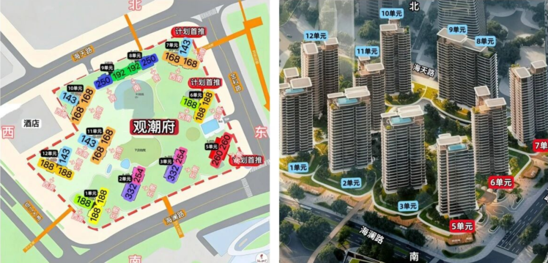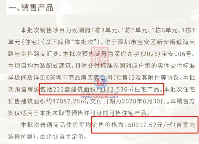 4月16日,观潮府获批预售,并发布销售方案,项目推售222套建面约143-536平的住宅产品,备案均价15.09万/㎡。