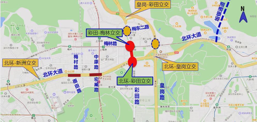 项目完工后,彩田路主线将由4车道升级为双向6车道,转向匝道将由单车道拓宽为双车道,进一步完善彩田-梅林-北环立交的交通转向功能,加强梅林片区对外交通衔接。