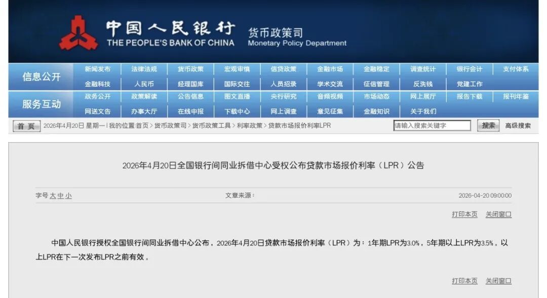 中国人民银行授权全国银行间同业拆借中心公布,2026年4月贷款市场报价利率(LPR)报价出炉:1年期LPR为3.0%,5年期以上LPR为3.5%,自2025年5月以来连续11个月维持不变。