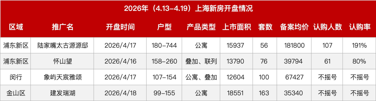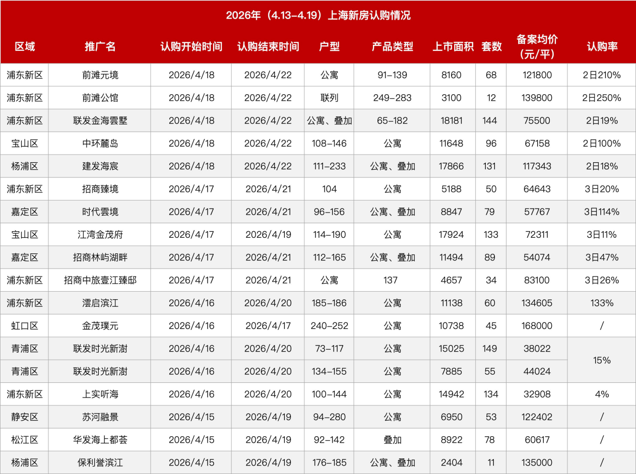 认购表现最为突出的是前滩板块的两个项目:前滩公馆(12套联列,139800元/㎡)2日认购率高达250%;前滩元境(68套公寓,121800元/㎡)2日认购率达210%。此外,浦东澐启滨江认购率133%,宝山中环麓岛2日100%,嘉定时代雲境3日114%,均表现活跃。