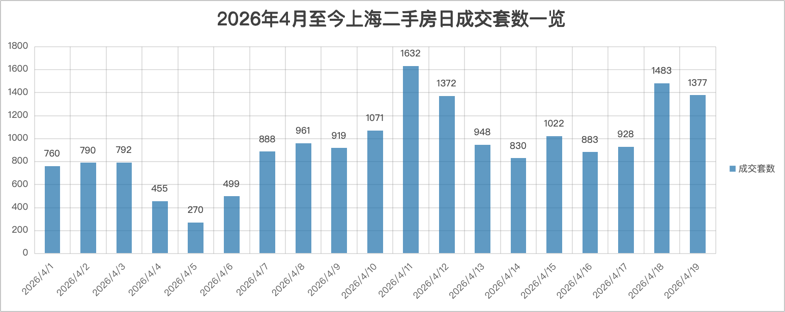 上海网上房地产显示,上周(4.13-4.19)全市二手住宅成交7471套,日均1067套。其中,18、19日连续两日成交突破1300套,成为周度冲高的关键。