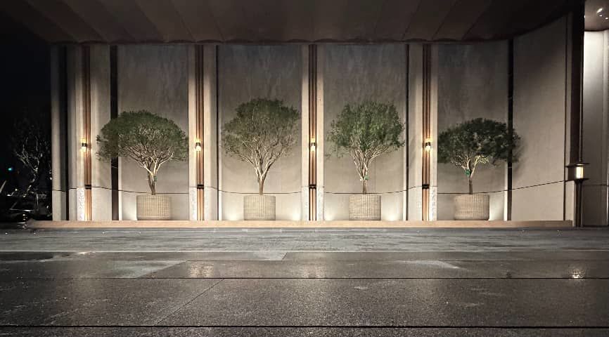 项目以「千帆归航」为设计灵魂,匠造约55米超尺度仪仗式入口,两侧对称矗立约11米风帆柱廊,如百舸争流、列队迎归,与世界前海湾的澎湃潮声遥相呼应,正上方约9.5米高的鎏金华盖凌空而起,威仪尽显;礼序高厅两侧,甄选八株九里香列植相伴,以自然幽香加冕每一段尊崇归家之旅。