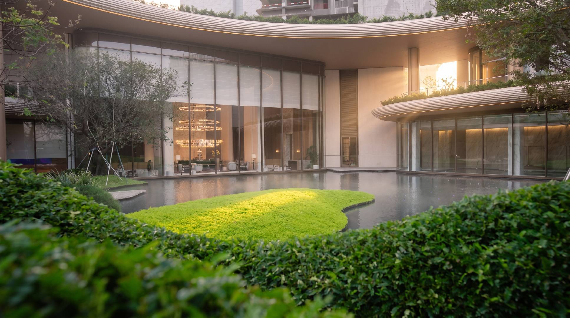 约800㎡中央水境,收藏天光云影与建筑轮廓,视线与心境无限延展,照见内心的从容丰盈。水波轻漾间,映照生活万般诗意,沉淀内心从容气度,让每一次驻足,皆是与理想生活的温柔相逢。