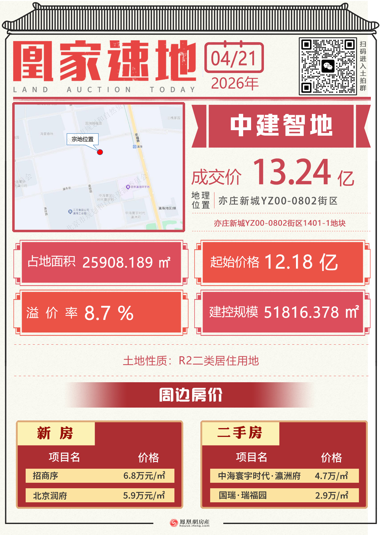 最终,经过49轮(现场竞价轮数)竞拍,中建智地笑到最后,以13.24亿元抢下亦庄瀛海地铁站旁这宗优质住宅地块,溢价率8.7%,楼面价约2.555万元/平方米。