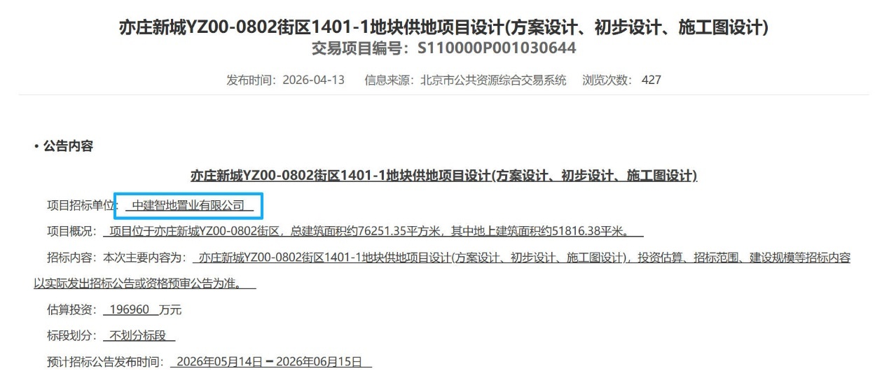 值得注意的是,早在4月13日,中建智地就率先提交了该地块的设计招标公告,总投资估算约19.696亿元,涵盖了方案设计、初步设计、施工图设计全流程,其拿地之决心可见一斑。