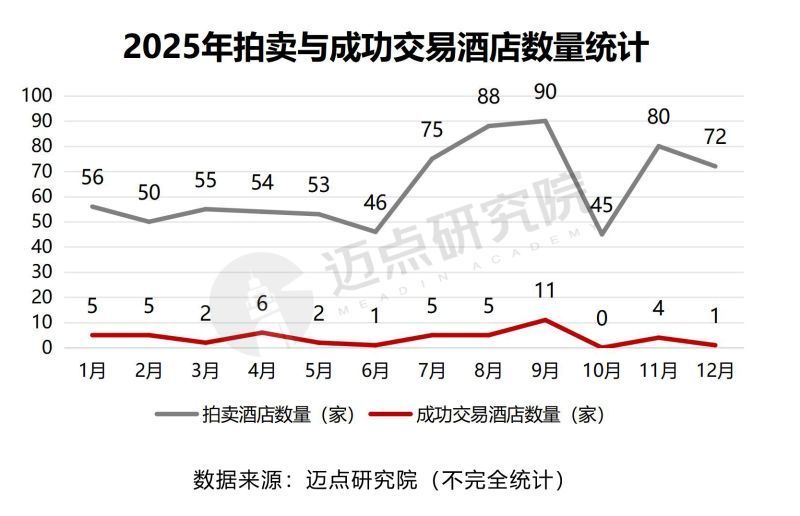 但酒店法拍的成交率并不高。据迈点研究院不完全统计,2025年共有692个千万元以上酒店项目拍卖,仅46个成交,占比6.6%,超过90%的酒店资产流拍。