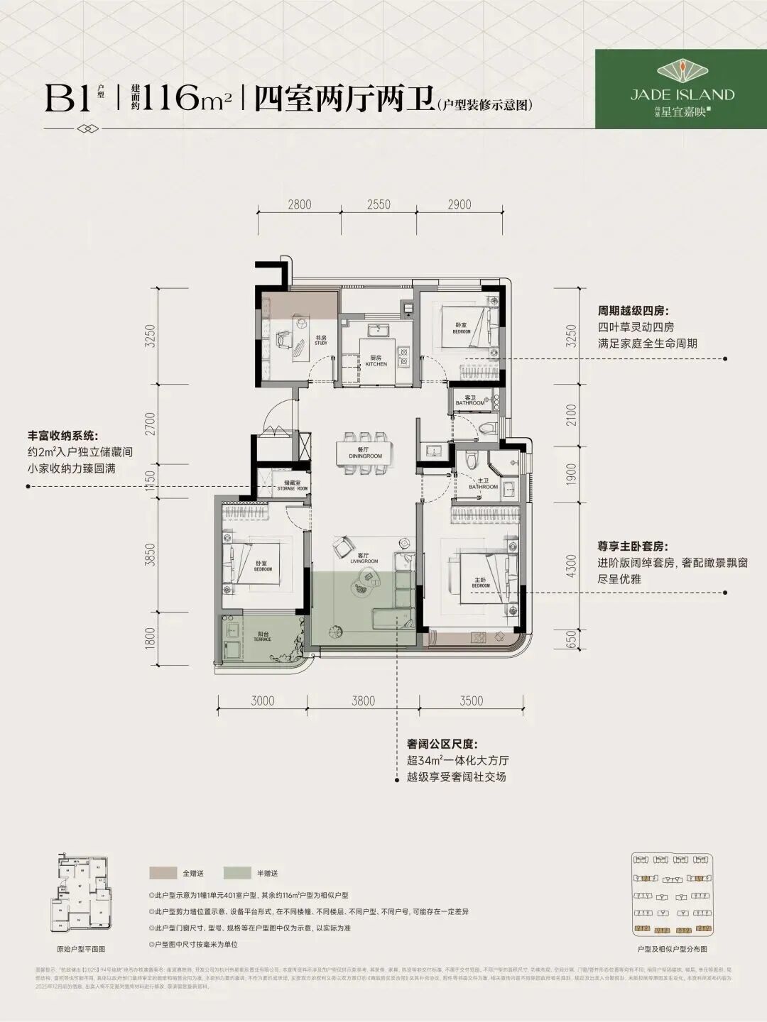 其中建面约116㎡户型为四房两厅两卫格局,额外配置独立储藏室,实际使用率达94%,空间尺度接近市面建面约130㎡产品,是目前杭州市场上同等面积段唯一实现该功能配置的户型。