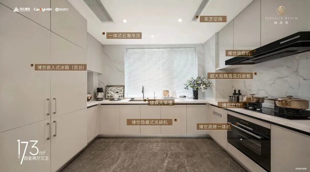 在当前3-4万单价新盘中,项目室内精装标准属于高档次水平。餐客厅铺设大理石地面,墙面采用软包、木饰面;中央空调、地暖、新风三大件配齐;厨房配置博世六件套,并单独安装东芝空调;卫浴采用松下、汉斯格雅、唯宝品牌。