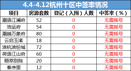 本周杭州共有8个项目公示购房登记中签率结果,所有项目均因登记人数不足无需摇号,与上周情况一致。值得注意的是,这些项目大部分采用线下落位的方式销售。
