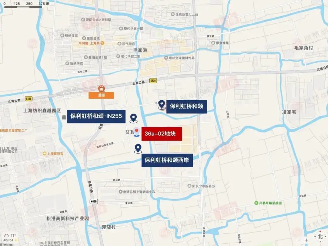 青浦区QPS5-0001单元36a-02地块,起始楼面价16000元/㎡,起始总价约5.4亿元,为本批次门槛最低的地块。地块位于重固板块,北侧是保利虹桥和颂·IN255,南侧是保利虹桥和颂西岸,恰好被保利的两个项目夹在中间。