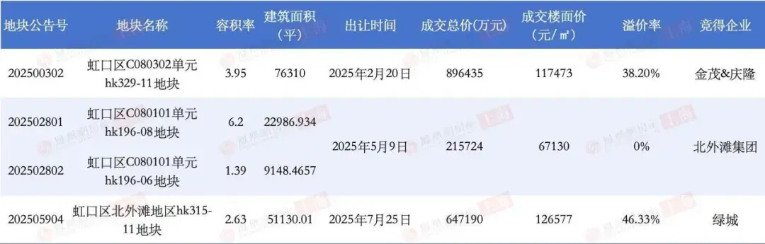 回顾2025年,虹口区虽然只成交了3宗涉宅用地,但总金额达175.9亿元,位列全市第二。其中金茂联合庆隆以89.64亿元竞得瑞虹新城地块,楼板价11.75万元/㎡,溢价率38.2%;绿城以64.72亿元、溢价率46.33%拿下北外滩地块,楼板价高达12.66万元/㎡。