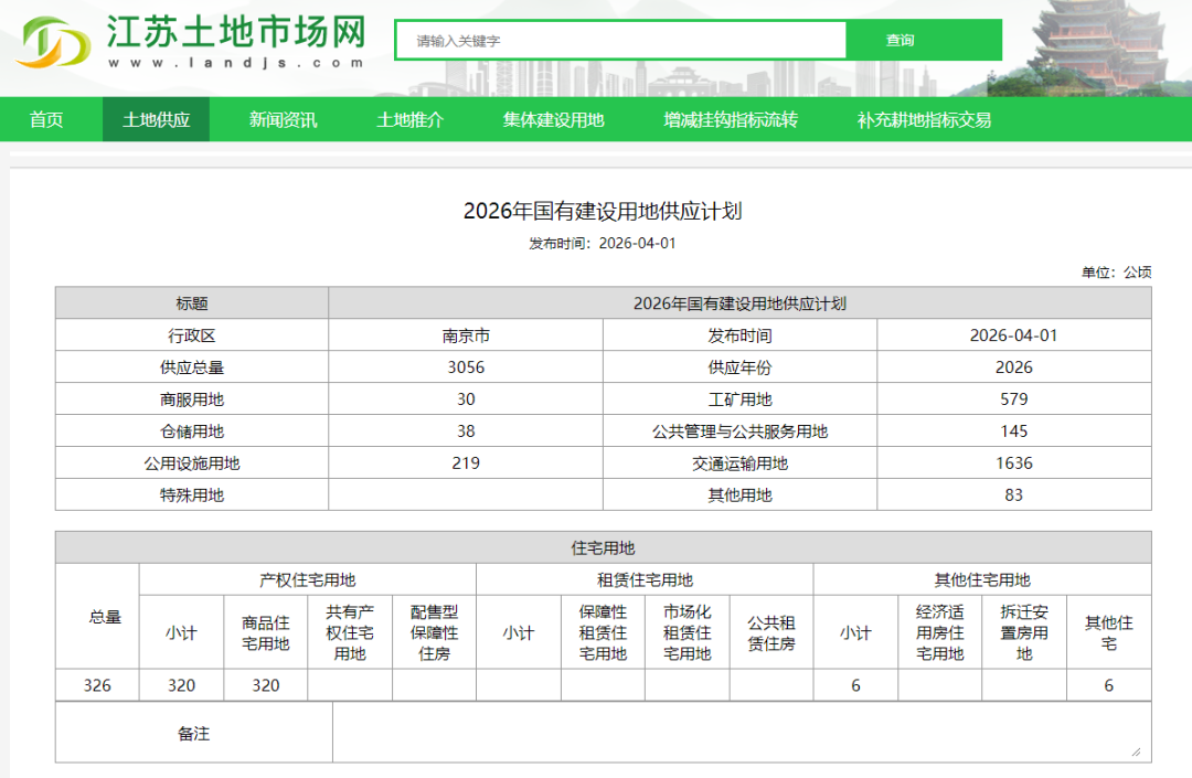 此外,根据南京2026年国有土地供应计划,全年总的土地供应计划是3056公顷,住宅用地计划供应326公顷,其中商品住宅用地320公顷,其他住宅用地6公顷。