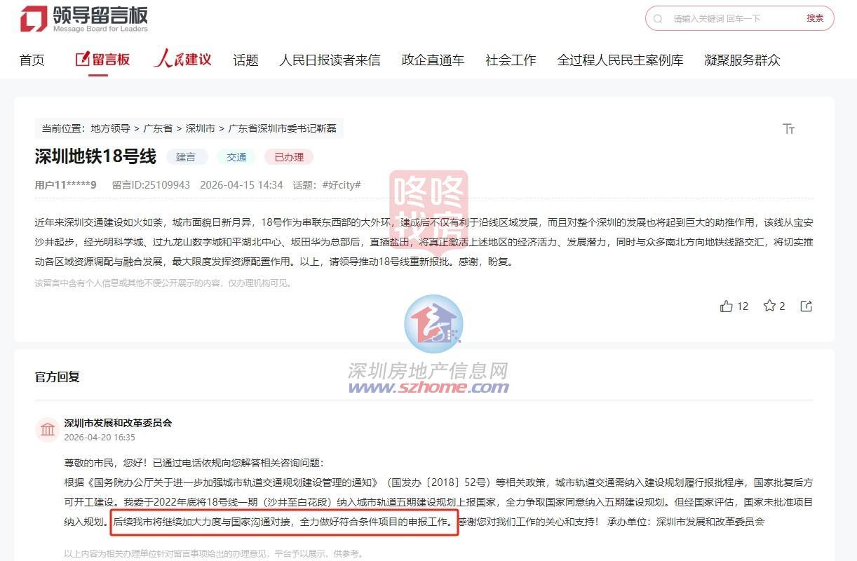 近日,有市民通过官方渠道建言,希望推动深圳地铁18号线重新报批,引发广泛关注。