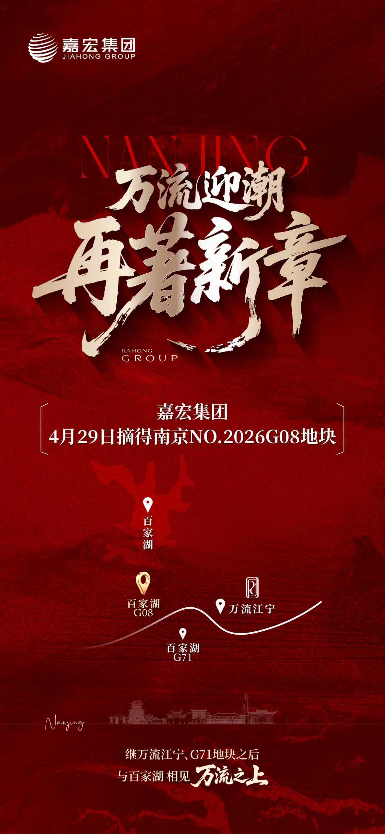 “流水不争先,争的是滔滔不绝。”4月29日,继万流江宁与G71地块之后,嘉宏集团于百家湖再落一子,以成交总价2.67亿元、约27.75%溢价率,成功摘得NO.2026G08地块,也意味着又一部全新的万流系著作,即将启幕金陵,与城市共同见证土地的价值、万流作品的雄心!