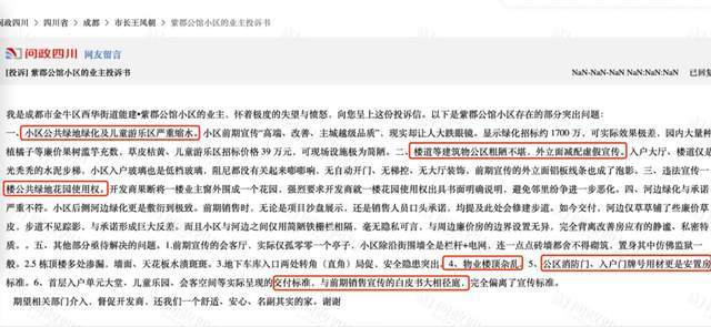 成都能建紫郡公馆,业主投诉绿化缩水、儿童活动区减配,实际交付跟前期宣传差距巨大。公区品质被吐槽。