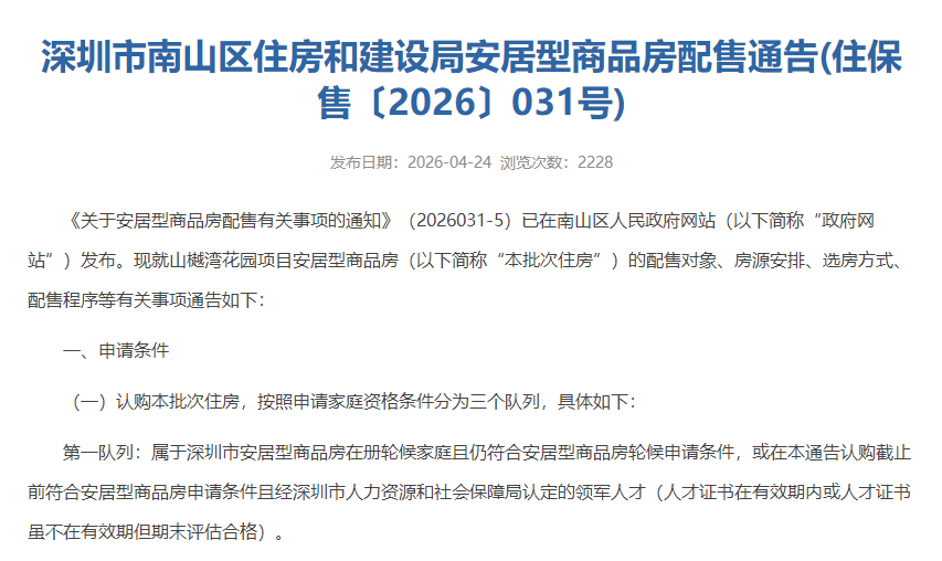近日,深圳市南山区住房和建设局发布官方公告,正式启动山樾湾花园项目新一批次安居型商品房的配售工作。